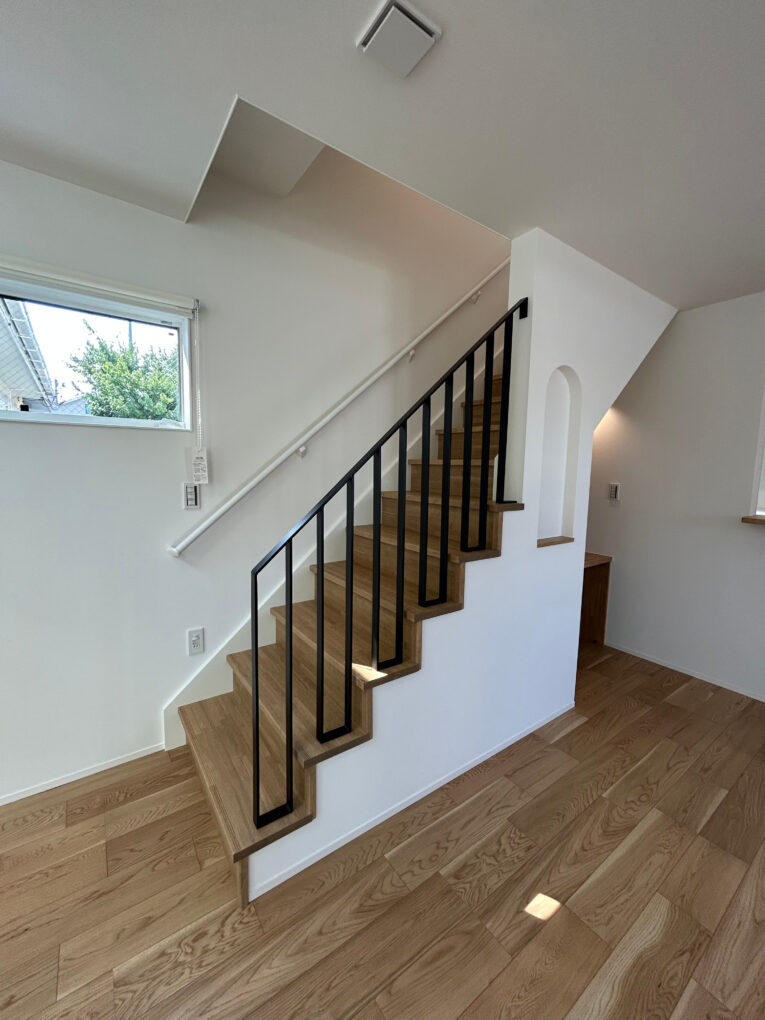 階段とフローリングを同じ色合いに合わせることで空間を広く見せ、手すりは近年流行りのアイアン製を採用して抜け感も出しました。