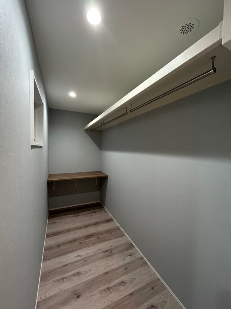 お施主様からの「各居室の部屋を最大限広くして、収納をまとめたい」というご要望を叶えるため、ファミリークローゼットを採用しました。さらに、2箇所に分けることで、整理整頓がしやすく、子どもの成長に合わせて柔軟に変えられるようにしました。