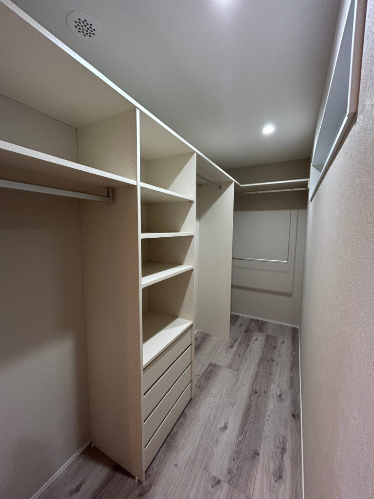 ファミリークローゼット1枚目は洗濯物を畳んだりできるカウンターとハンガーパイプを取り付けていて、2枚目は既製品の収納ユニットを組み合わせました。