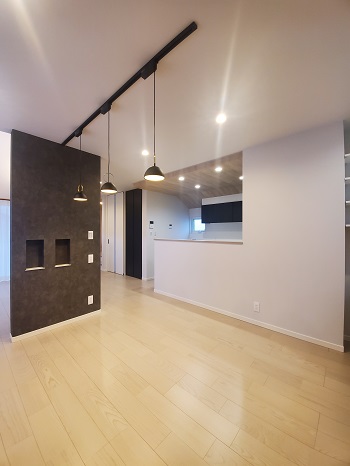 リビングの中心にある壁は空間を分けるだけでなく、クロスの色を変えることでワンポイントにもなっています。