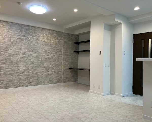横長の高窓とバルコニーに面した掃き出し窓からたっぷりと自然光を取り込み、明るく開放的な居室に仕上げました。 白を基調とした内装に、ナチュラルな木目フローリングを組み合わせることで、すっきりとした中にもあたたかみを感じられる空間となっています。 一面にはダークカラーのアクセントクロスを採用し、空間全体を引き締めながら上質な印象を演出しています。